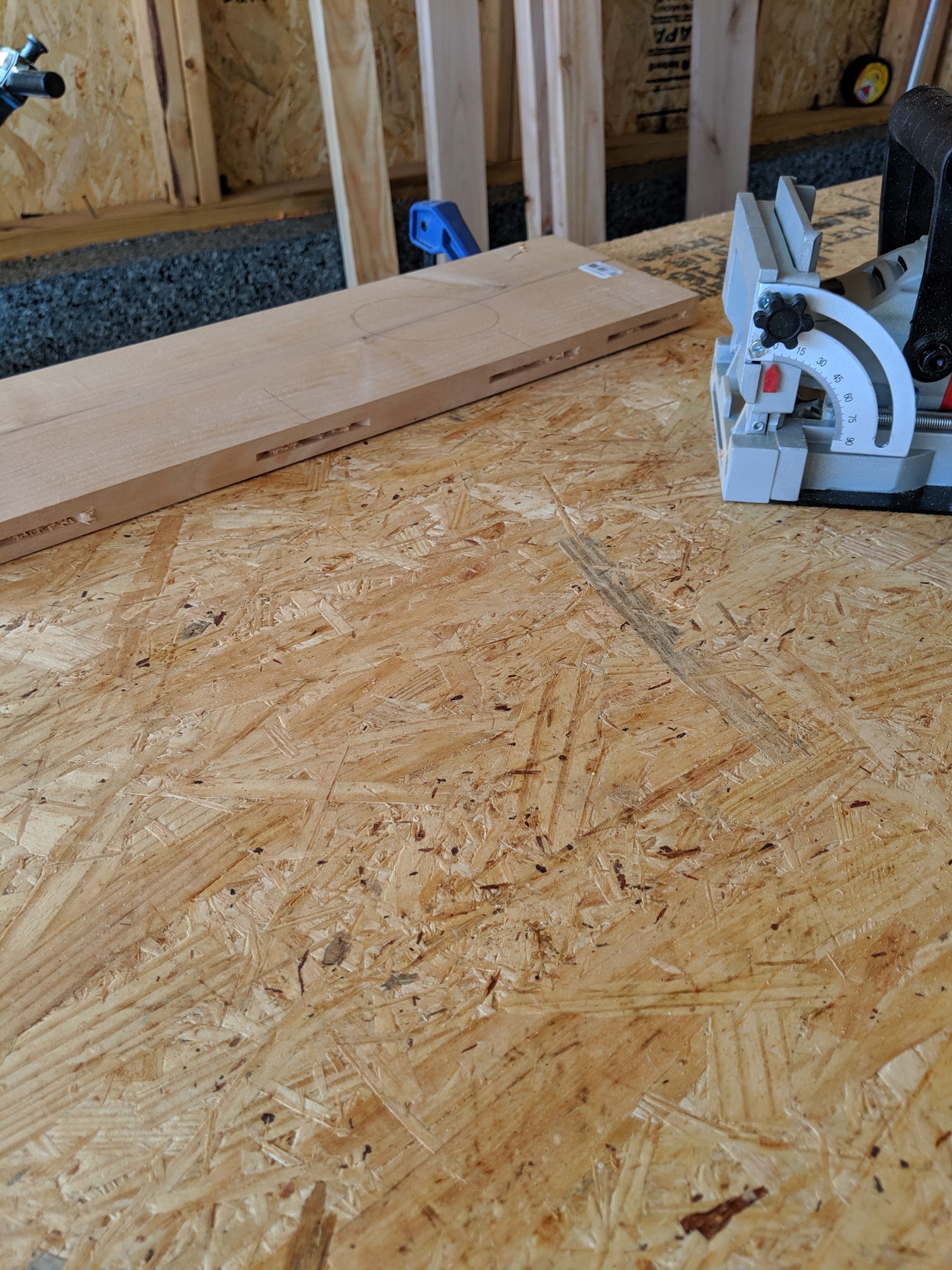 Not really knowing what I was doing, I opted to make the first cut 3" from the end of the wood and then every 6". This may have been overkill but I don't know. Using the biscuit joiner on my makeshift workbench (saw horses and particle board) I made all the necessary cuts. After making the cuts, I used a biscuit to clean out each cut to ensure there was no sawdust leftover.