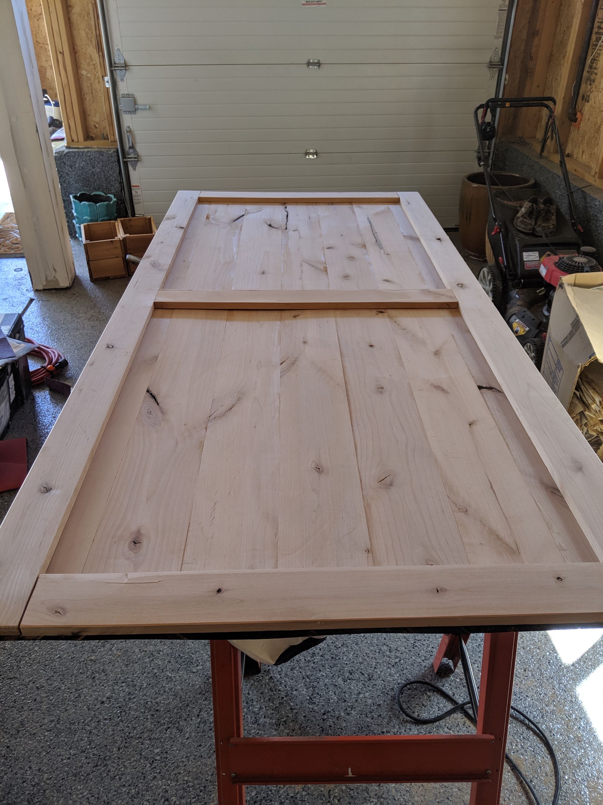 Now that the door was all joined together, it was time to cut it down to the right height. This was probably the most nerve-racking part of the whole process since a mistake here would have ruined the whole project. I measured the door opening multiple times to be sure. I cut just enough off the top of the door to even out that side since most of the nice knotting and character of the wood was up there. Then I measured and marked the door height and cut off the excess from the bottom of the door. I also figured that any imperfections in my first cut on the top would be less noticeable than on the bottom.