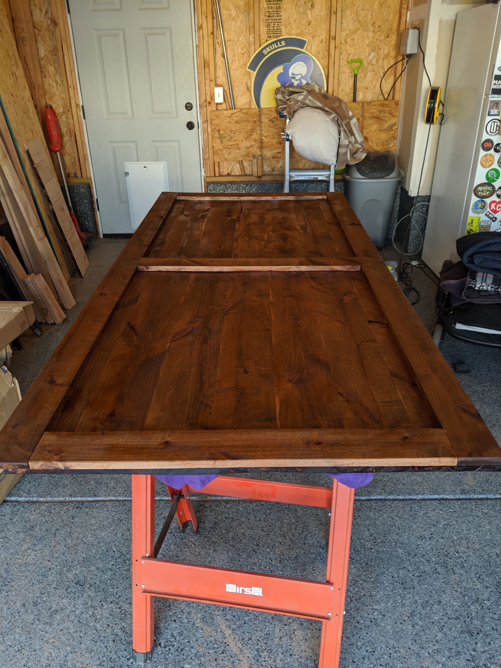 Over the next few days I would pop out to the garage to put on whatever layer was appropriate. The pre-stain needed to be stained on top of between 15 minutes and 2 hours after application but other than that, there were no real time constraints here. One coat of pre-stain, one coat of stain, and 2 coats of the poly (with sanding in between).