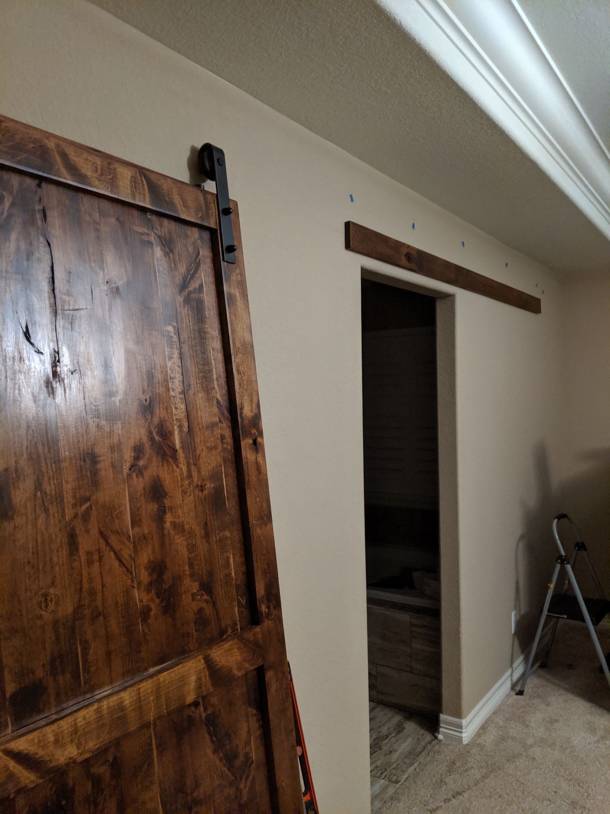 A common architectural feature out here in Colorado is to not actually put a door between the master bedroom and the master bathroom. So we decided a barn door was the best option but given the non-standard (wider than normal) size of our doorway, the only pre-made options were going to cost us north of $1,200 without even factoring in installation. For a little "fun" and to save some money, we decided to build our own!