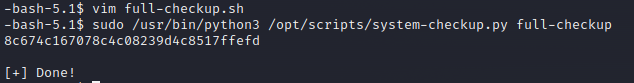 This is indeed the case. I can create a file in a directory I can write to. I could use this to execute any command, but in this case I just did cat /root/root.txt to get the flag. I also had to set the file with executable permissions with chmod +x full-checkup.sh.