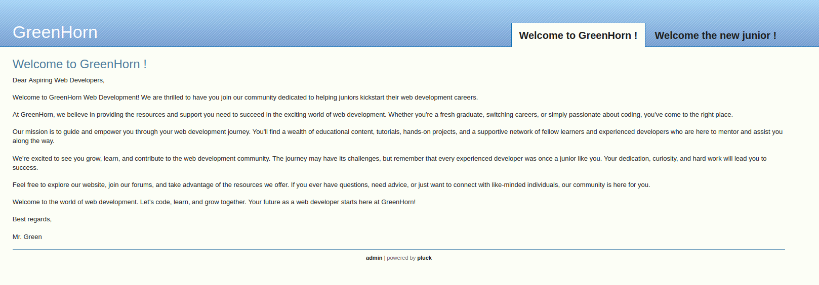 In the path GreenHorn/data/settings/pass.php there is a password hash. A Google search quickly reveals this as "iloveyou1". Going back to the main page, we see that this successfully authenticates us.