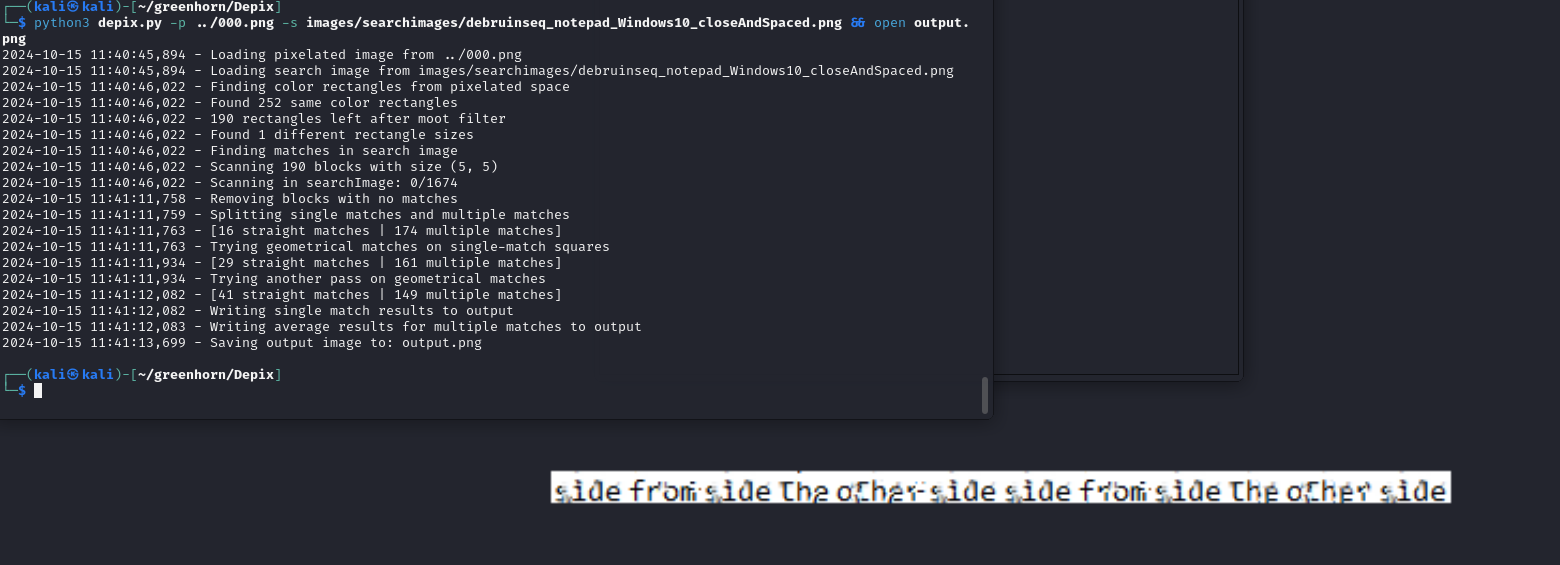 pdfimages -all "Using OpenVAS.pdf" ./The output adds a - to the file name which was not playing nice in the terminal so I renamed it without the dash via the Files GUI. Next, with the image extracted was to attempt to depixelate it. Trying the image with each of the sample images included with the repo, I had success with this command.
