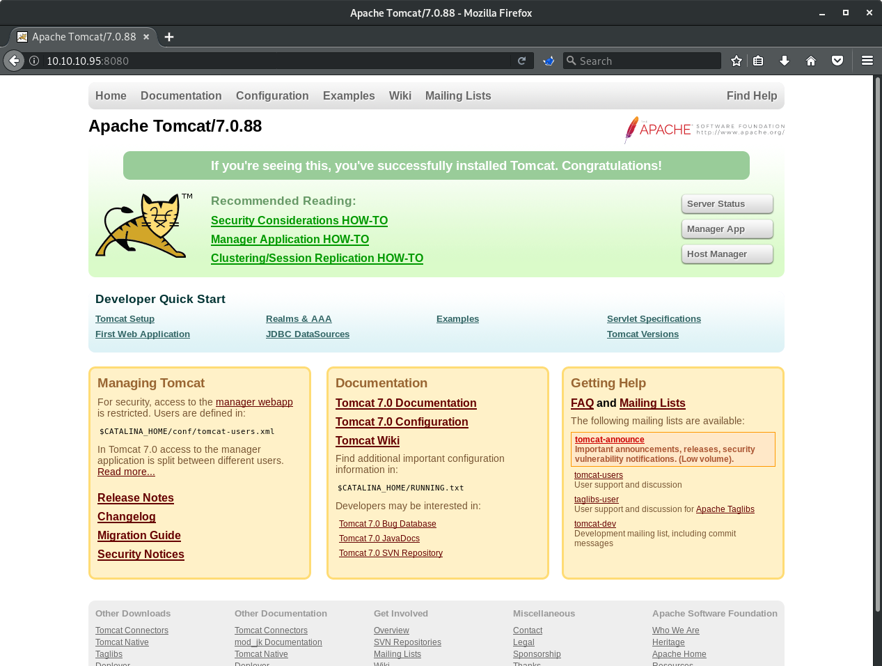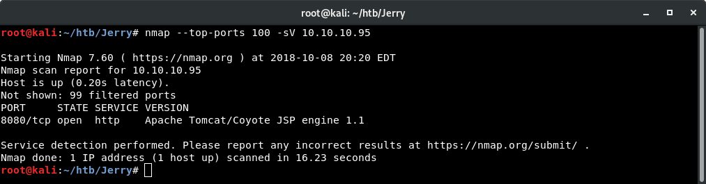 nmap --top-ports 100 -sV 10.10.10.95Which revealed an Apache Tomcat Server running on port 8080.