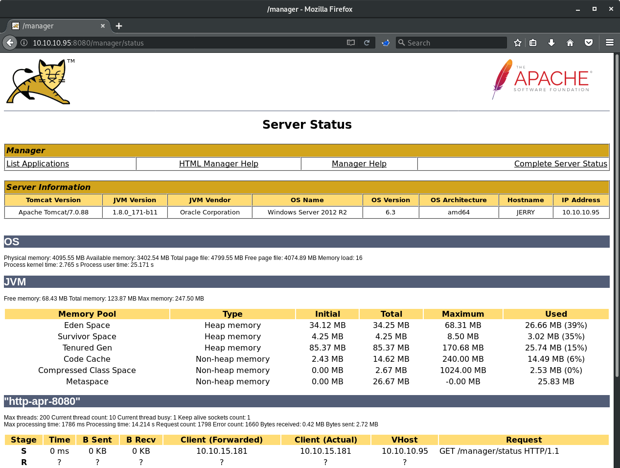 With access to the Tomcat Manager, owning this box is now trivial. A little more Google searching will yield many guides on uploading a malicious WAR file to gain access to the OS.