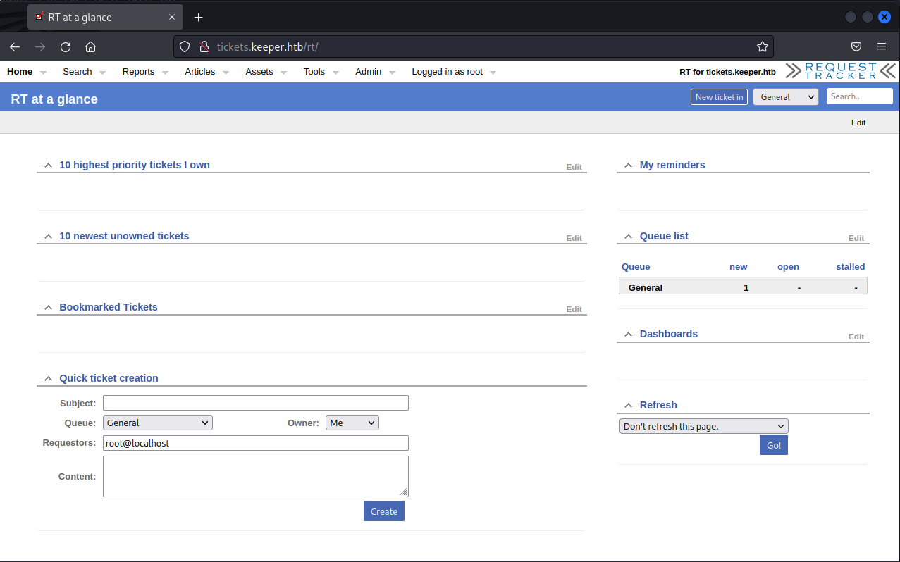 Request Tracker seems to have several vulnerabilities but all seem to require authentication. A quick Google search reveals the default credentials to be root:password and in this case, the default credentials work!