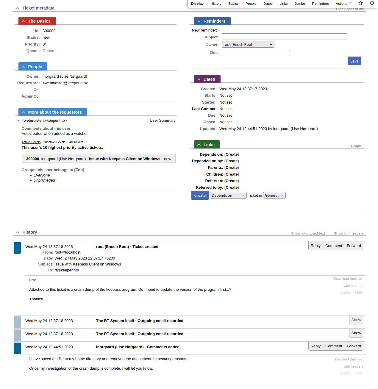 With successful authentication to the application, many of the disclosed vulnerabilities come into play. Reviewing the vulnerabilities, only a few apply to our version of the app (4.4.4) and the ones that do are no immediately useful. Further investigation of the app reveals a ticket that indicates there may be some juicy information on Lise Norgaard's computer.