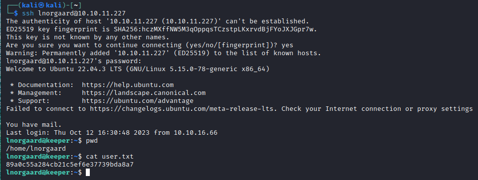 Reviewing users, we see a note that Lise Norgaard has had their initial password set to Welcome2023!. Trying this password to SSH to the machine as lnorgaard is successful and we have our initial user access.