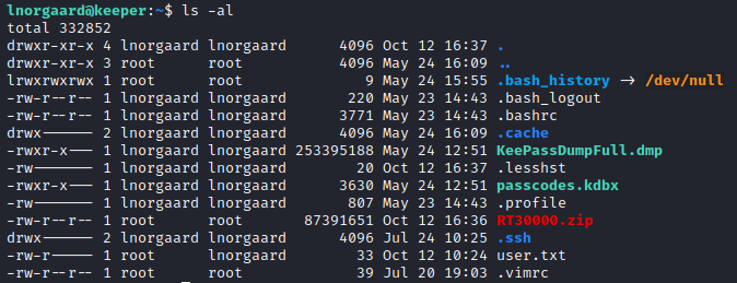 Looking in lnorsgaard's home directory, there are two interesting files that we already expected based on the ticket we saw; KeePassDumpFull.dmp and passcodes.kdbx. The KDBX file is a KeePass vault and presumably, we should be able to recover the key to that file from the DMP file.
