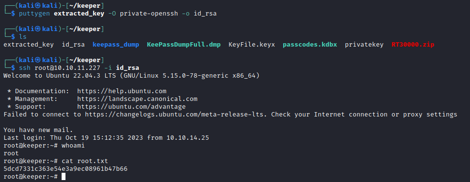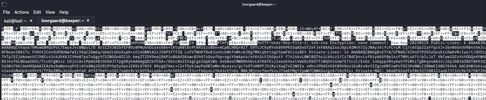 Copying the true message with appropriate characters did successfully open the KeePass vault and we see that there is a root PuTTY key. To convert the key to something I could use from Kali, I followed this StackOverflow question.