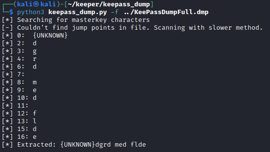 However, I did realize after these keys did not work for anything and after a TON of Googling, that this was not the intended path. Turns out that there is a CVE for dumping the master database password out of a KeePass 2.x memory dump and numerous exploits to take advantage of this.