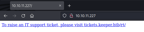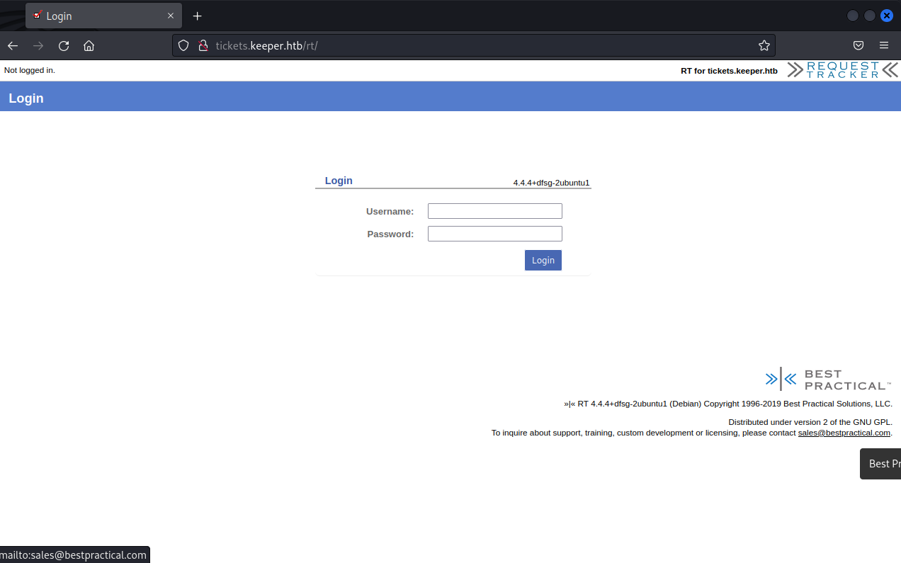 To make some of this work easier, I am going to add keeper.htb and tickets.keeper.htb to my hosts file. Navigating to the linked site reveals a logon page for what looks like some fort of ticketing system.