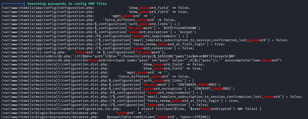 Looking in the PHP config for Chamilo, I see the database credentials are chamilo:03F6lY3uXAP2bkW8. I found these using the commands grep db_pass configuration.php and grep db_user configuration.php
