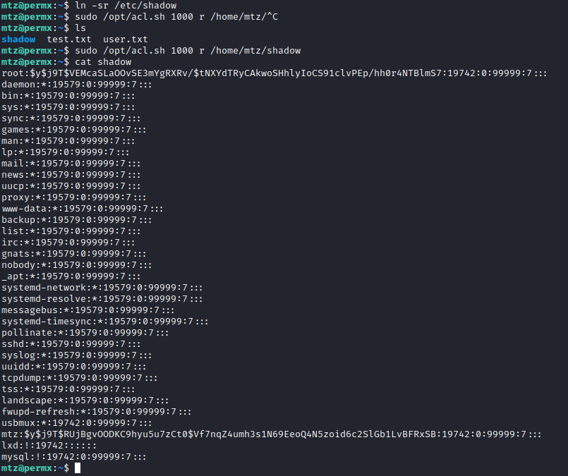 /usr/bin/sudo /usr/bin/setfacl -m u:"$user":"$perm" "$target"This runs the setfacl command after checking if the target is a file and fails if the target is not in the /home/mtz or uses a .. sequence. So we need to find a way to bypass these controls.