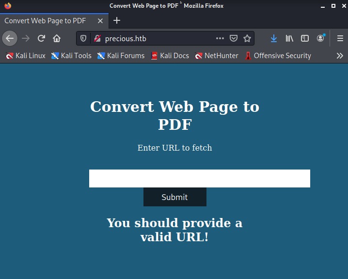 A simple NMAP scan to just get the lay of the land initially. Only two ports appear to be open. SSH appears to allow for password auth, and the web port hosts a page that allegedly converts pages to PDFs.