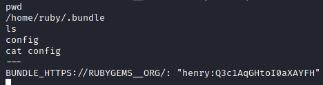 After some local enumeration, I was able to find some credentials for henry in the ruby user's home directory.