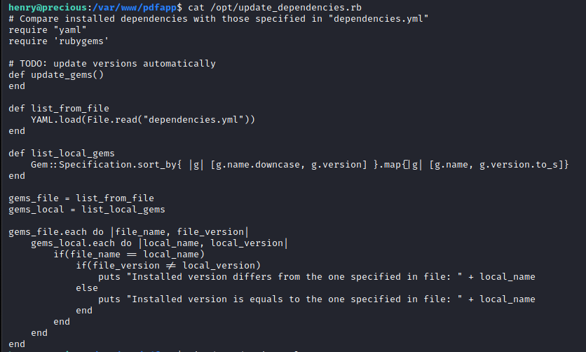 From the file, I can see that it will load a dependencies.yml file from the current directory. Researching this for a quick second led me to this blog that outlines a gadget for command execution via YAML loads. With this I am able to read the root flag successfully and could ultimately escalate to the root user.