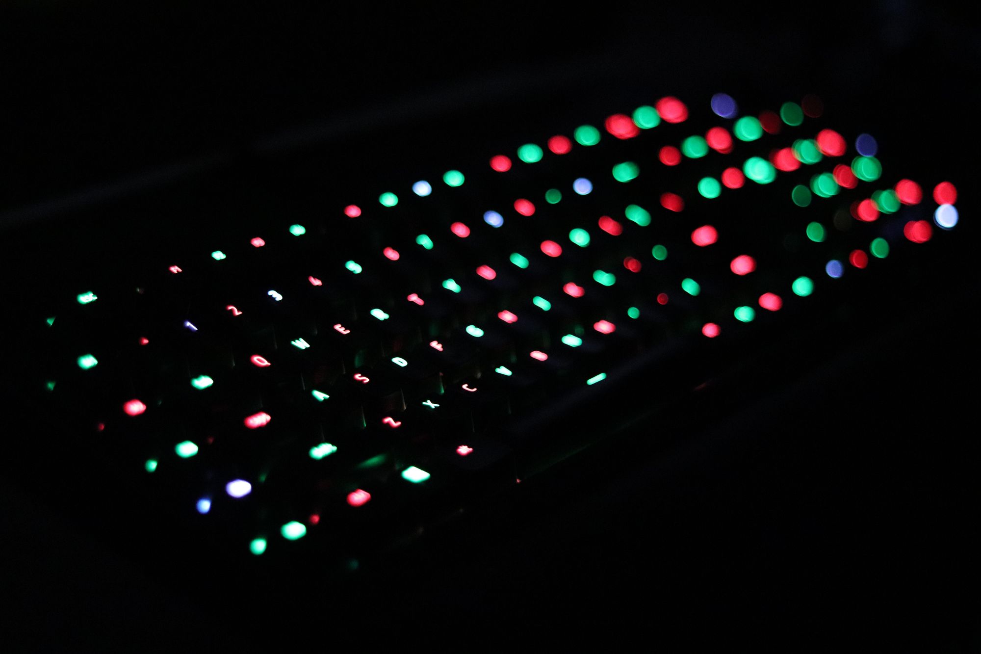 Up until this point, I had mostly stuck with the more default lighting features of the keyboard. After seeing a few videos online of holiday themes, I knew I had to follow suit. There is also a key press ripple effect in candy-cane colors but I am not nearly skilled enough with a camera to record that. Photo credit to my wife.