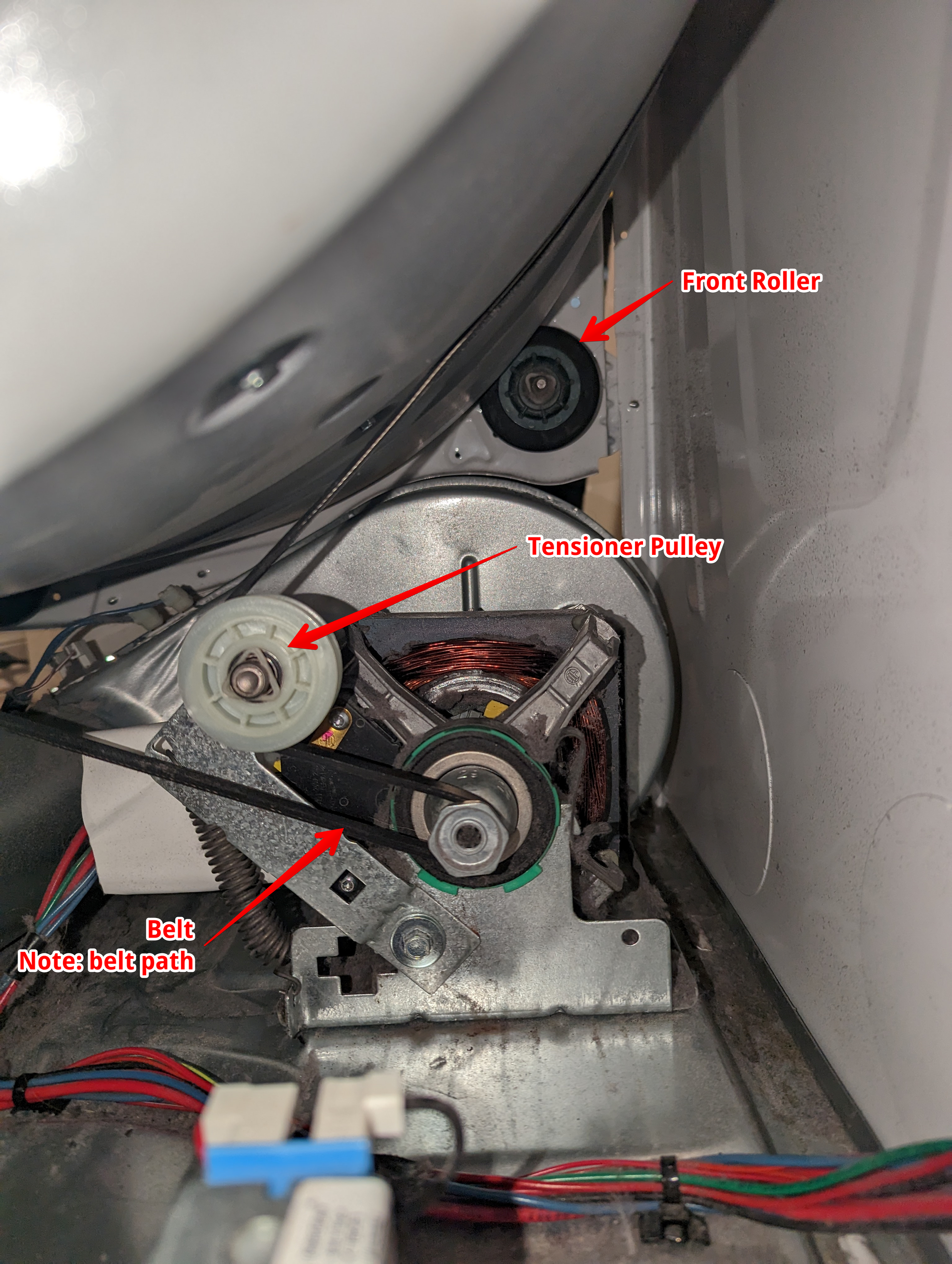 There are 4 rollers, 2 front and 2 rear, at the bottom of the drum that could be the problem. Listen to those. The next item is the tensioner pulley. It is a small wheel right next to the drive motor pulley. If you want you can take off the belt (not the routing) and spin that pulley on its own to see if it moves freely or makes any noise. In my case, this revealed my issue because I could hear a quieter version of the sound when hand-turning the pulley. The last item is to spin the motor freely and check for odd noises.
