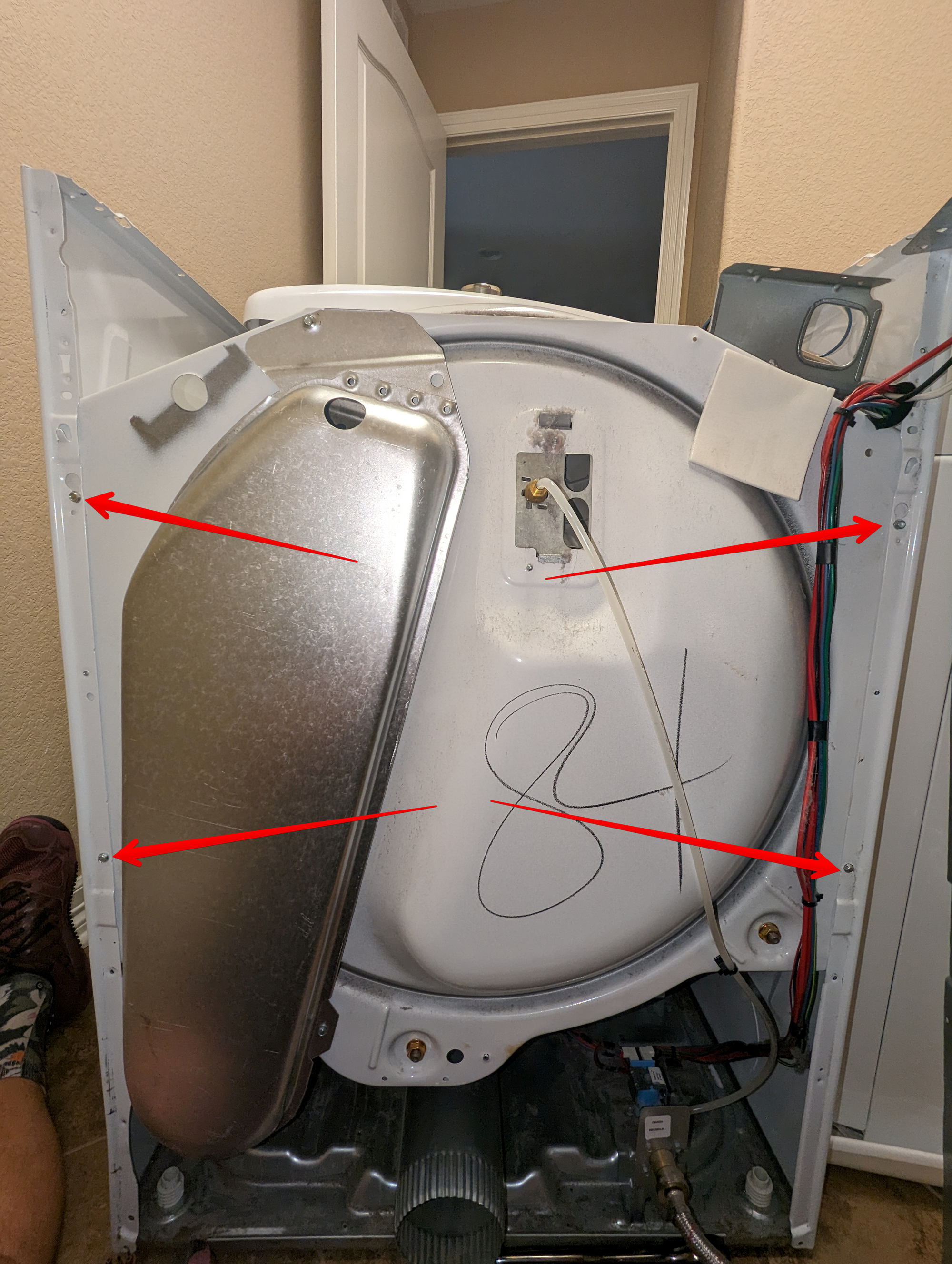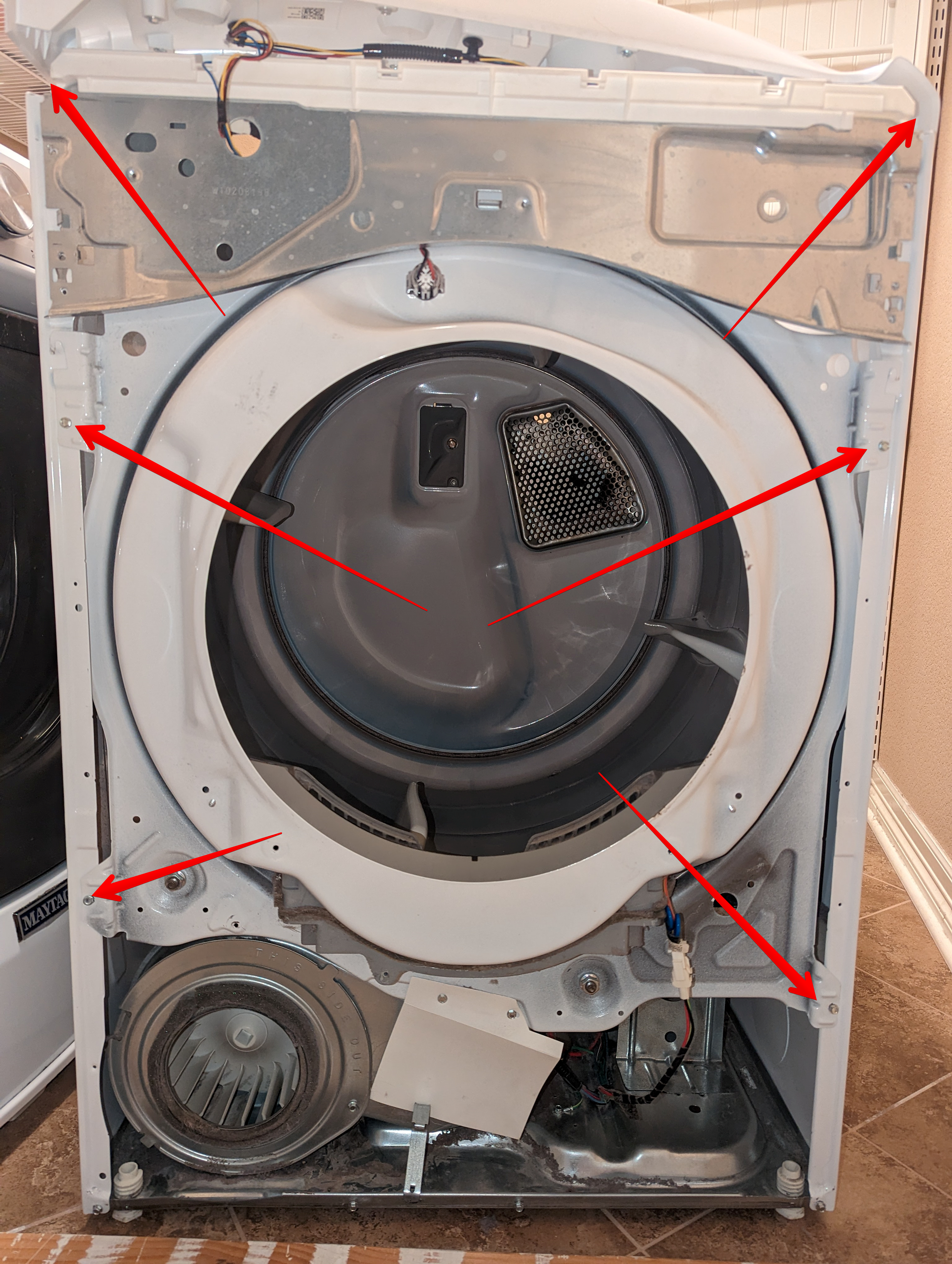 This dyer is exceedingly annoying to get access to any components. You cannot take off the front or back panel on their own. So first, the top panel has to come off with a couple screws at the top rear of the dryer. The top panel then slides towards the rear slightly and can be listed out of place.