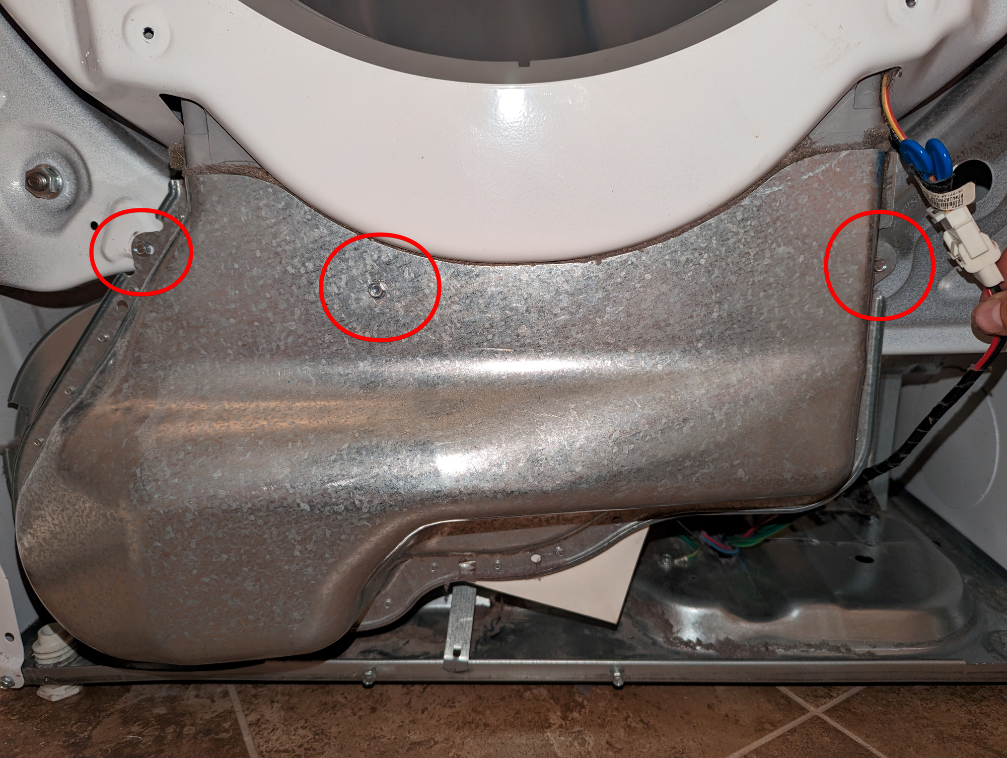 With the top, front, and back panels off, you should be able to see/access almost all the components that could be causing the issue. With the help of someone else and while keeping all extremities away from the drum, have them rotate the drum and see if you can further narrow down where the sound is coming from. The sagging circuit board bracket from the previous step will make some noise, so hold that out of the way.