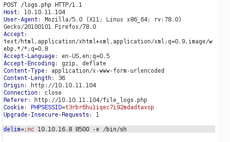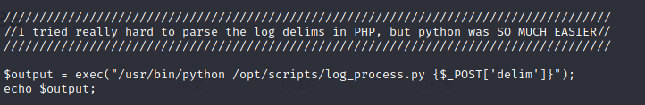 It looks as though I should be able to control the delim parameter and inject something into this Python code by repeating the request in Burp. Using a reverse netcat shell, I was able to get access to the box.
