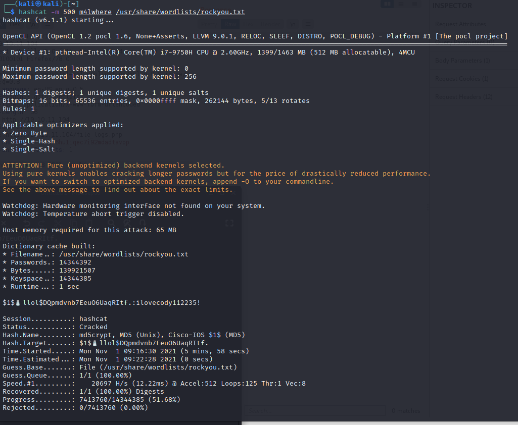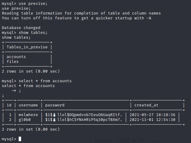 At this point, I want to use the MySQL creds to see if possibly I can get access to a re-used password for M4lwhere. After upgrading my shell to interactive, I was able to log into MySQL. Navigating the DB, I was able to get my hands on a hashed password for m4lwhere.