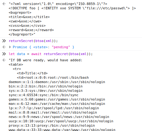 Circling back to the form submission, I was able to execute an XML External Entity injection attack with the following payload style:
