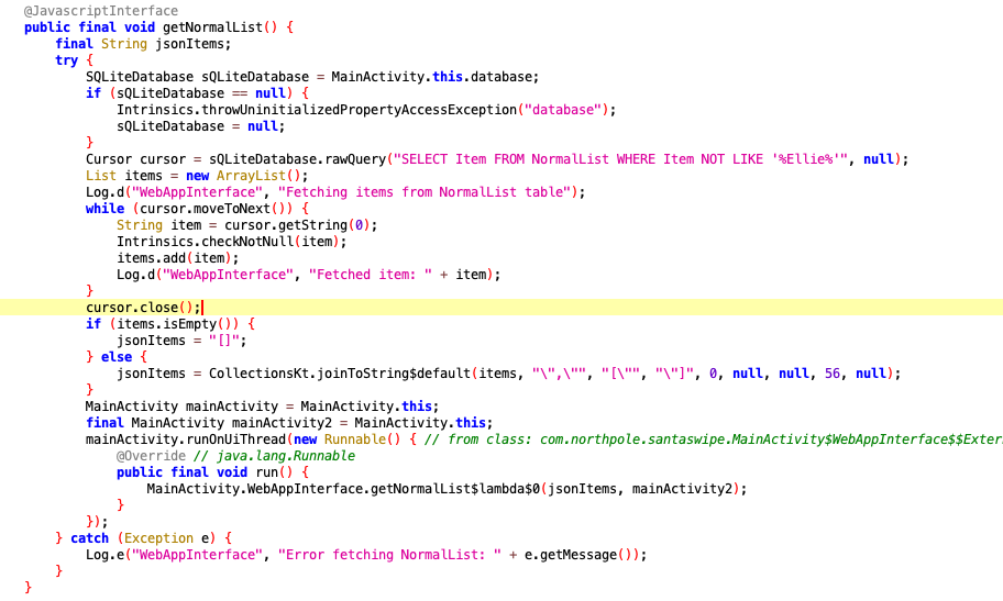 Searching the code in JADX for getNormalList we find some associated code in the com/northpole.santawipe/MainActivity file that seems to indicate the data is coming from an SQLite database.
