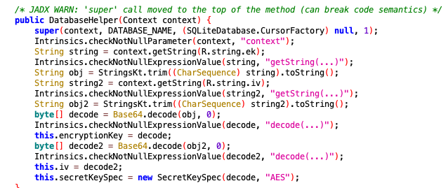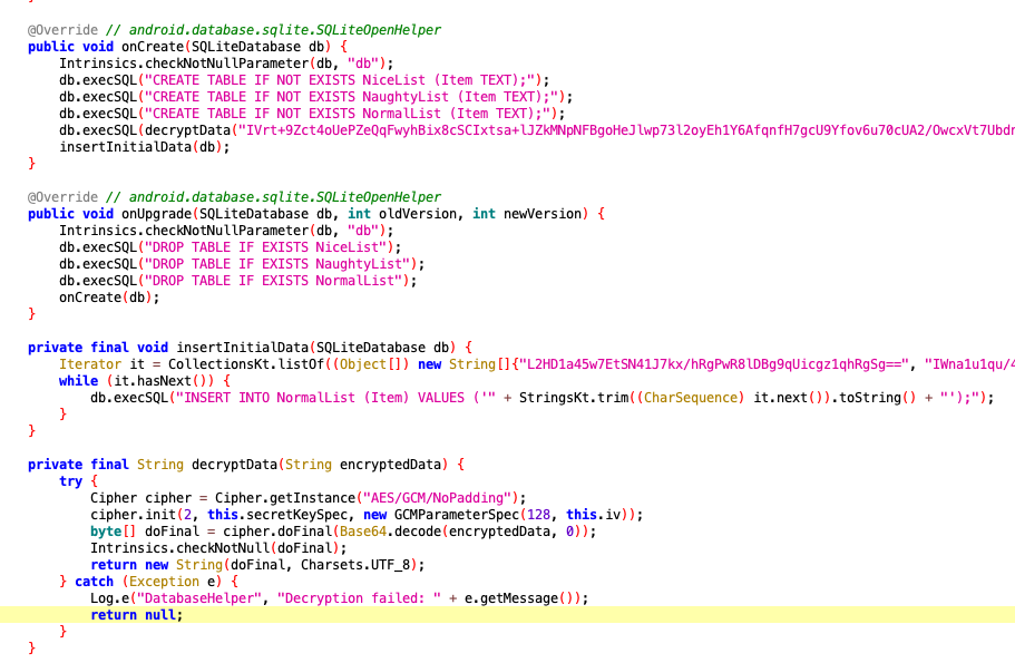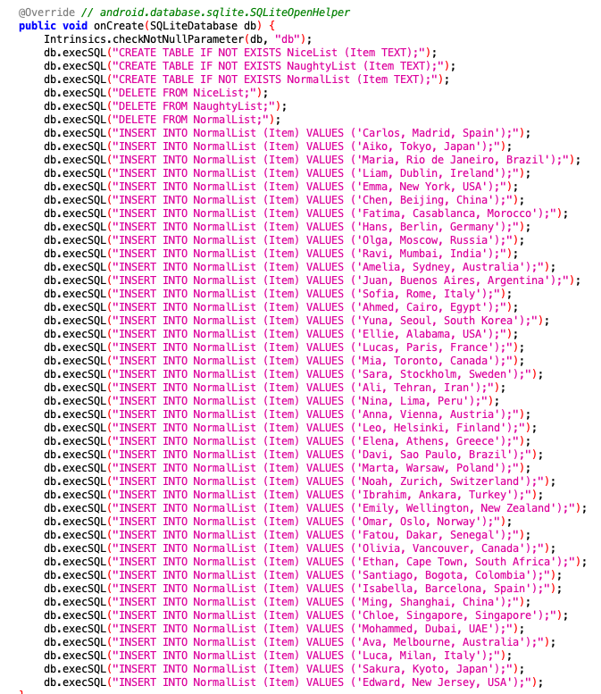 Sure enough, looking in com/northpole.santawipe/DatabaseHelper we can see the database setup commands.