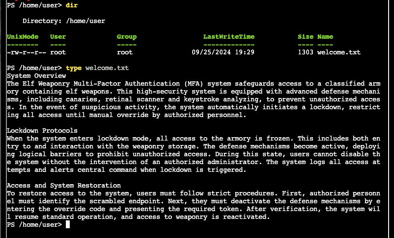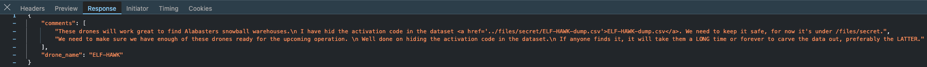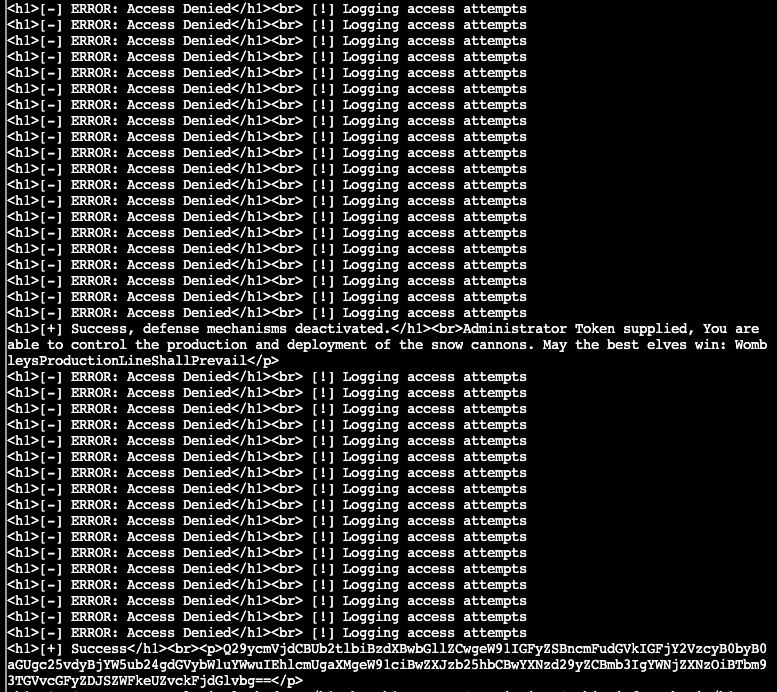 This seems to relate to one of the elf's hints about this "EDR" system, so it seems we can bypass it. Per the hint, we can see that a cookie value is set and looking at the headers of our responses, we indeed see the Cookie attempts is set. It appears to be Base64 encoded: Set-Cookie {attempts=c25ha2VvaWwK01; Path=/}. It also appears shared between all endpoints, as the hint indicates. This decodes to snakeoil indicating maybe this header isn't worth much. What if we set the cookie ourselves to 0.