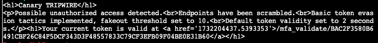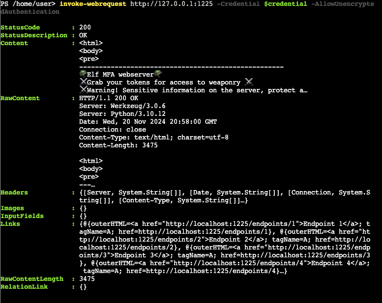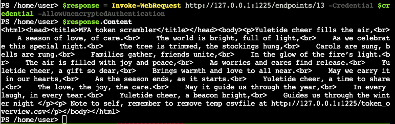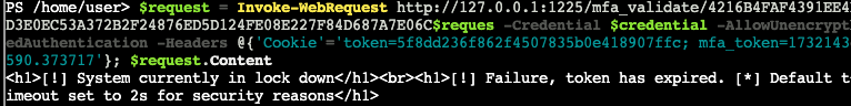 $request = Invoke-WebRequest http://127.0.0.1:1225/mfa_validate/4216B4FAF4391EE4D3E0EC53A372B2F24876ED5D124FE08E227F84D687A7E06C$ -Credential $credential -AllowUnencryptedAuthentication -Headers @{'Cookie'='token=5f8dd236f862f4507835b0e418907ffc; mfa_token=1732143590.373717'}; $request.ContentThe response here indicates that the token is only valid for 2 seconds for security reasons, so we will need to script this together.