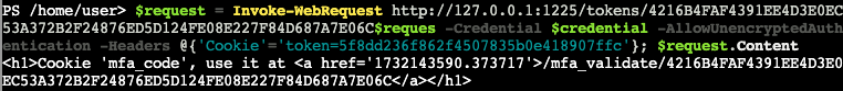 $request = Invoke-WebRequest http://127.0.0.1:1225/tokens/4216B4FAF4391EE4D3E0EC53A372B2F24876ED5D124FE08E227F84D687A7E06C -Credential $credential -AllowUnencryptedAuthentication -Headers @{'Cookie'='token=5f8dd236f862f4507835b0e418907ffc'}; $request.ContentWe get a response with an MFA code and indication that we should set it in the Cookie value mfa_code.