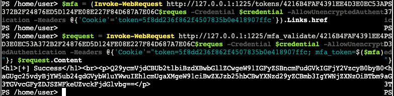$request = Invoke-WebRequest http://127.0.0.1:1225/mfa_validate/$hash -Credential $credential -AllowUnencryptedAuthentication -Headers @{'Cookie'="token=$($token); mfa_token=$($mfa); attempts=11"}; $request.content