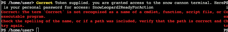 Correct Token supplied, you are granted access to the snow cannon terminal. Here is your personal password for access: SnowLeopard2ReadyForActionGold