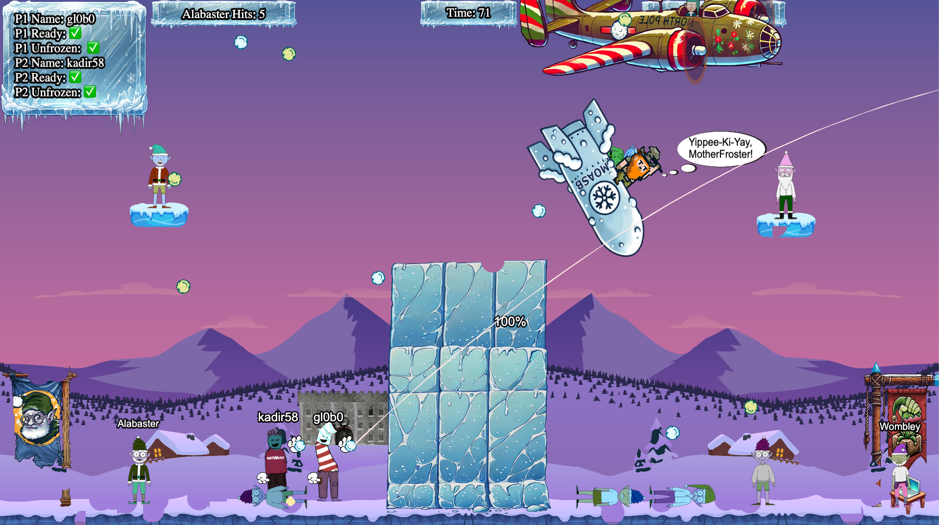 Presumably, I am going to have to modify some of these to win the game. Specifically, you can use the snowballp message to rapid fire snowballs with larger blast radii and at a much higher rate than the game allows. You can even set a different start position to make things a bit easier. With this, winning the game is not too difficult.