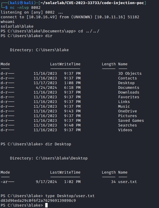 Using a payload from the POC linked above and a Powershell reverse shell, I was able to get access as blake