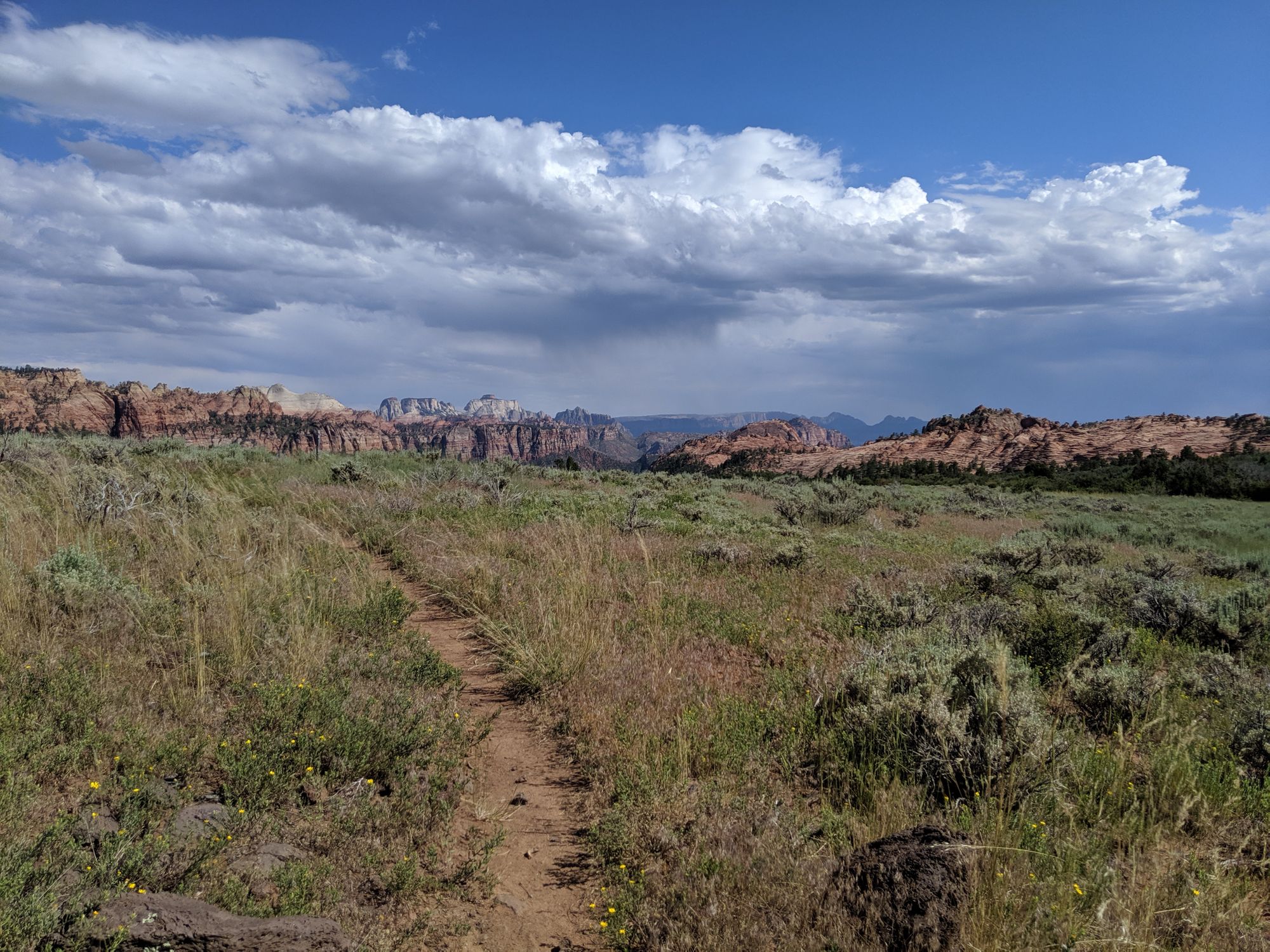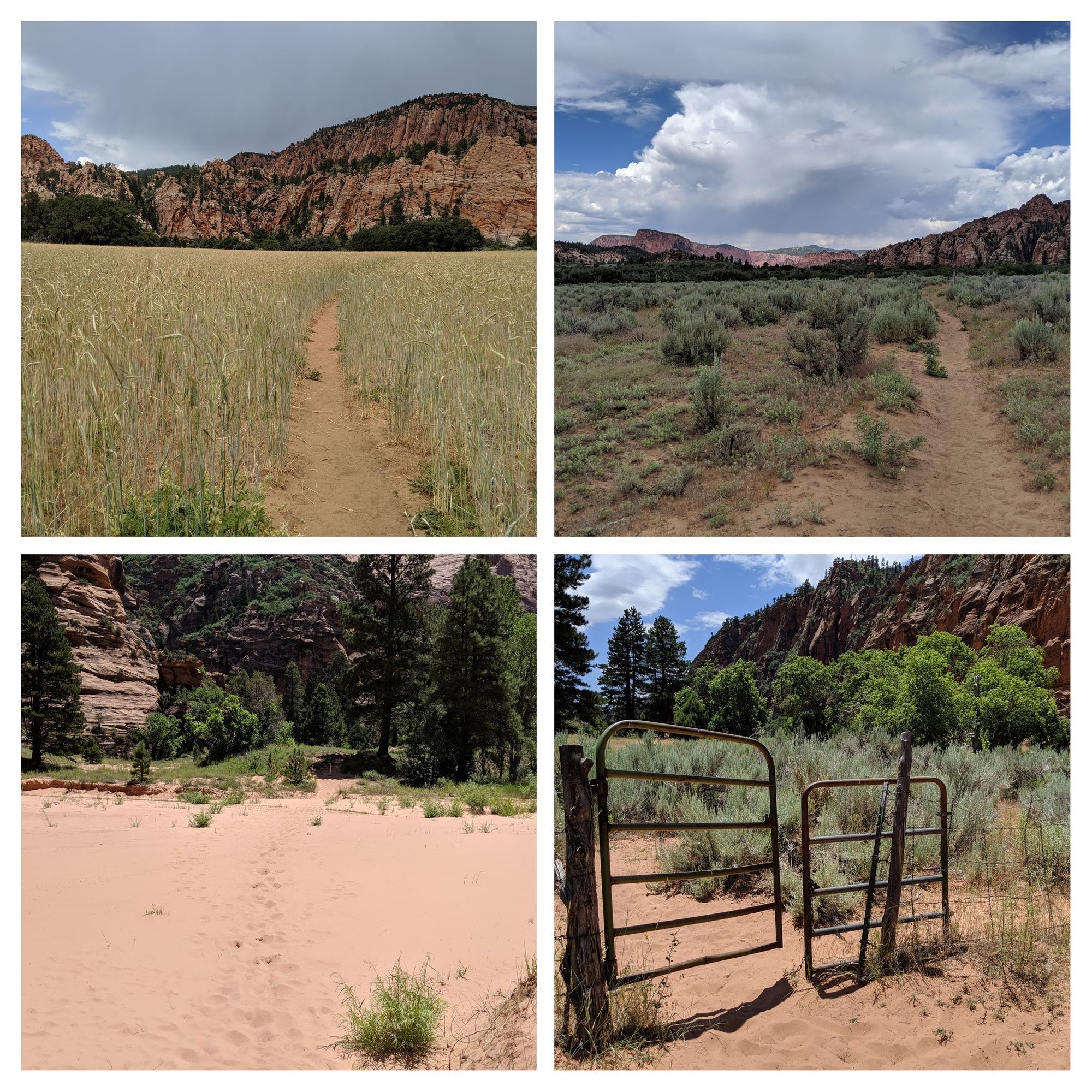 For all the good I said about the La Verkin Creek trail, Hop Valley was not as fun. Although the valley was beautiful and the shallow flow of the meandering creek made for some lush scenery, the intense mid-day heat and the soft sandy trail made this part not so enjoyable. Although shade was generally available near the trail, the trail itself was almost entirely uncovered and the soft sand persisted for probably 80% of the trail. My keychain thermometer showed the mid-day temps very near to 100˚F. Towards the end though, there were some beautiful flat meadows of what I think might have been wild wheat. By the time I arrived at the Hop Valley trailhead, my knee was in bad shape and I was thoroughly worn out; but I still had 4 miles to go for the day. I decided to take a long 45 minute break at the trailhead in the shade of the restrooms. Unfortunately, due to the proximity of pasture land to the Hop Valley Creek, water from the creek was not recommended as a water source and I was starting to get worried I might not have enough water for the rest of the evening.