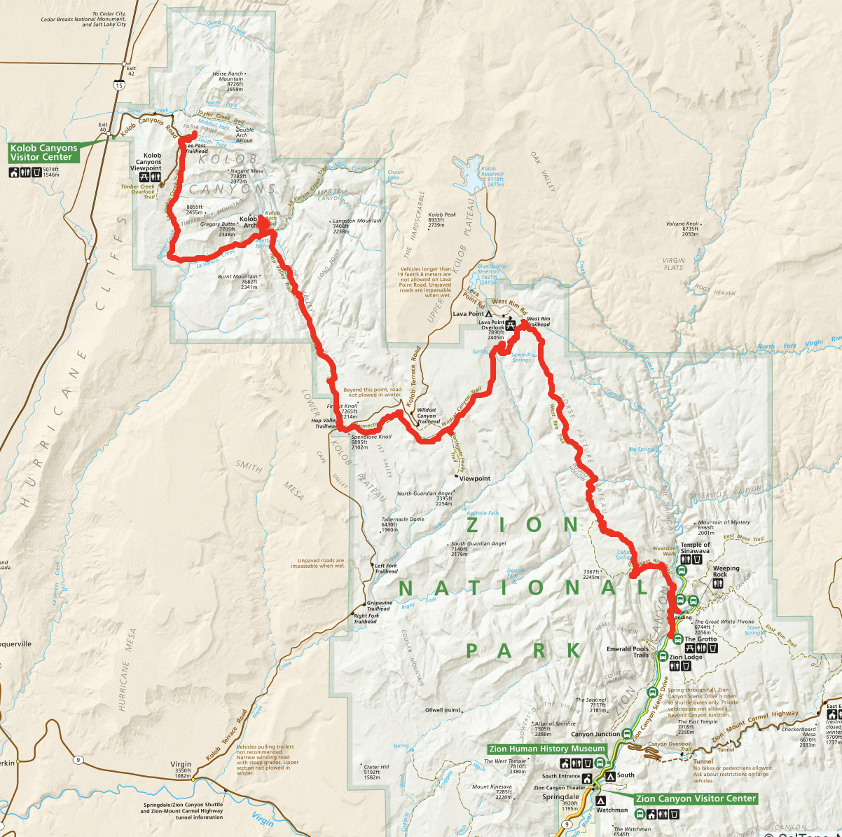 After getting my permits, I planned to drive to the Lee Pass trailhead on the northwest side of the park to start my hike off on the La Verkin Creek Trail, followed by Hop Valley and the Connector Trail to the Northgate Peaks.